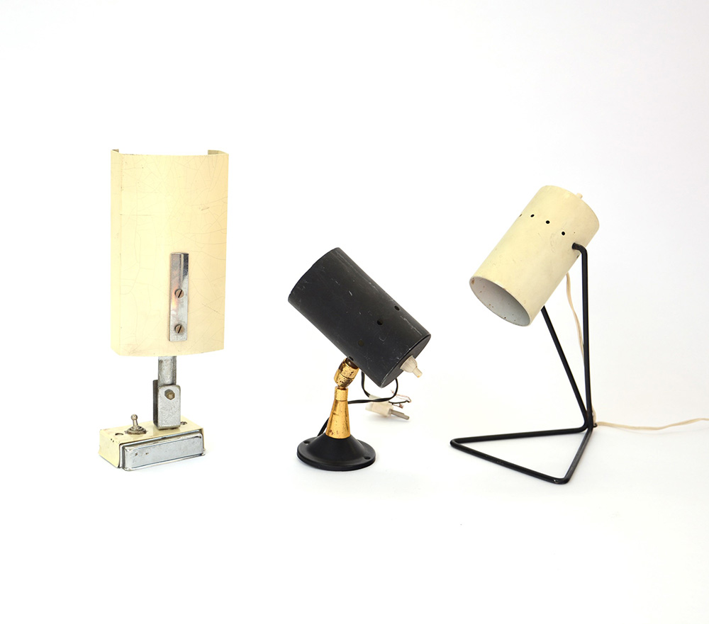 Stilnovo (attribuito) Lotto composto da due lampade da parete con paralumi in alluminio verniciati nero e bianco. Unite a una lampada da tavolo in metallo verniciato nero e bianco (misure diverse) (difetti)