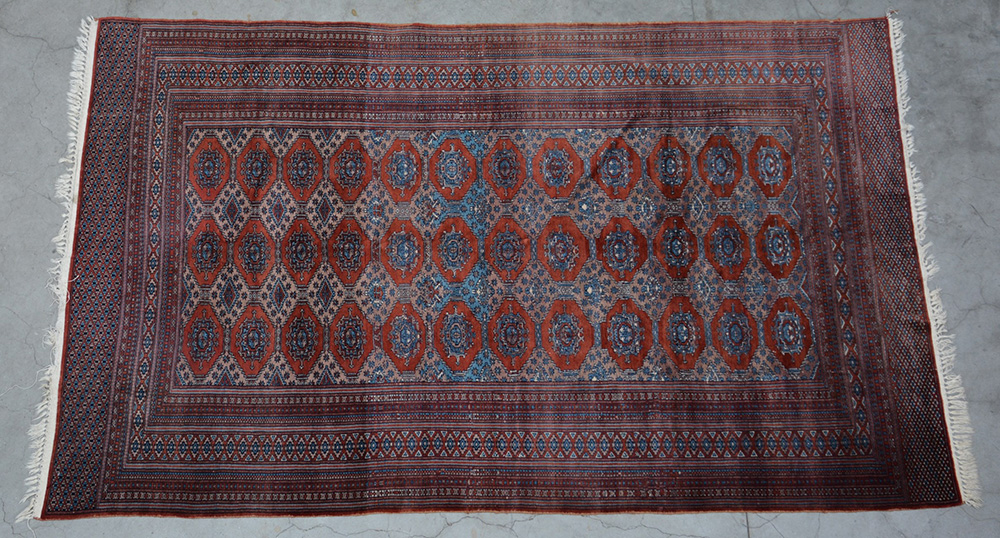 [Tappeti] Tappeto Bhoukara, Pakistan, sec. XX. Disegno nei toni dell'arancio, azzurro e beige (cm 250x154)(difetti)