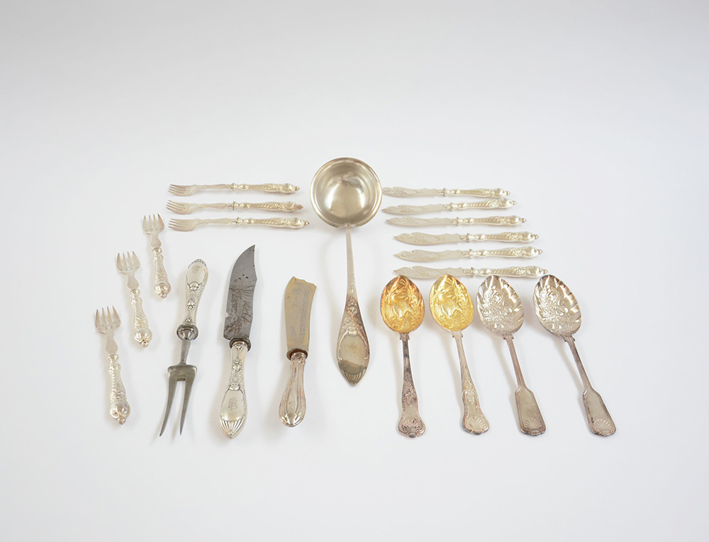 Lotto in metallo argentato composto da quattro posate da frutta secca, dodici posate da pesce, una coppia da arrosto, un mestolo ed un coltello da dolce (difetti)