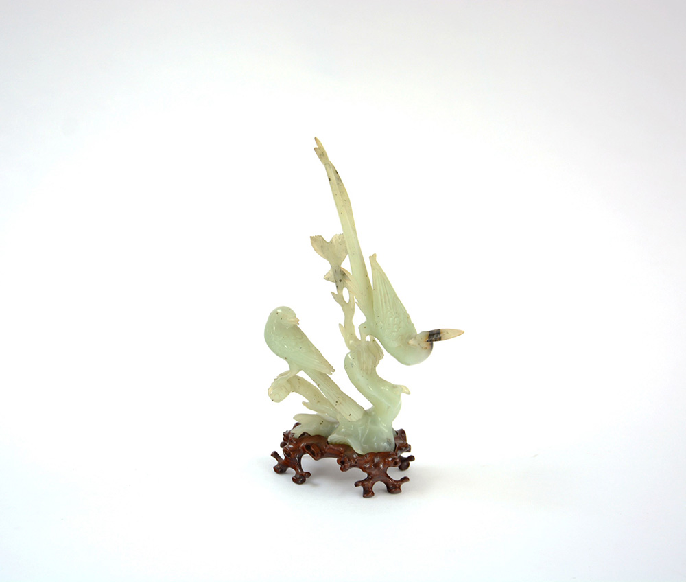 Scultura in pietra dura raffigurante uccelli dalla lunga coda su rami, base in legno Cina, sec. XX (h. 24 cm.)(lievi difetti)