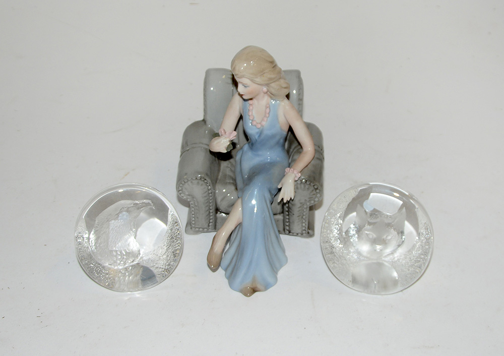 Lotto composto da due fermacarte in vetro e una statuetta in ceramica raffigurante una donna assisa