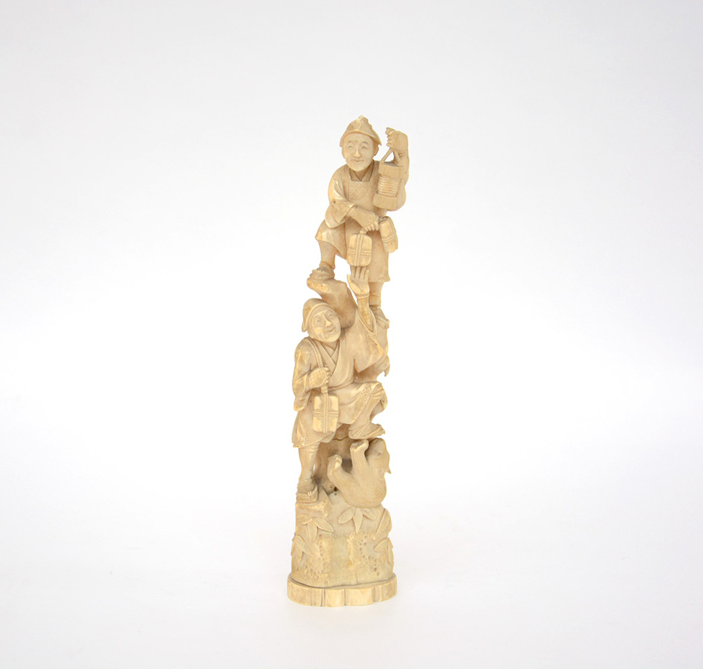 Gruppo in avorio scolpito raffigurante due viandanti e cucciolo di orso. Giappone, sec. XX (h. cm 33) (difetti e restauri)