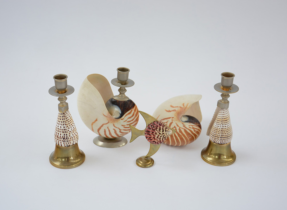 Lotto composto da tre candelieri con fusti decorati da conchiglia unito ad un pesce di simil decoro e una conchiglia (difetti)