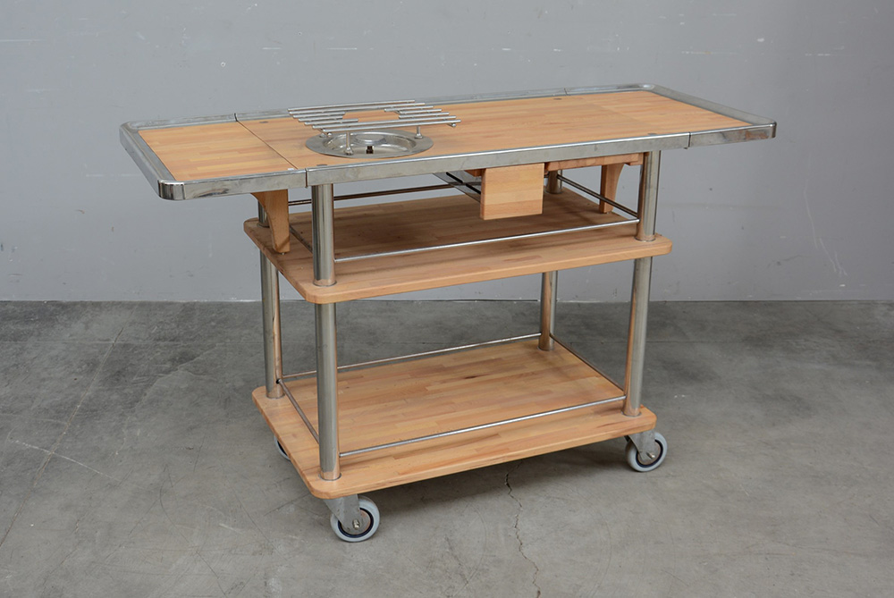 Carrello scalda vivande con piano ad alette e ripiani sottostanti, munito di fornello con attacco per bombola, montanti e finiture in acciaio (chiuso cm 86x80x52) (difetti)