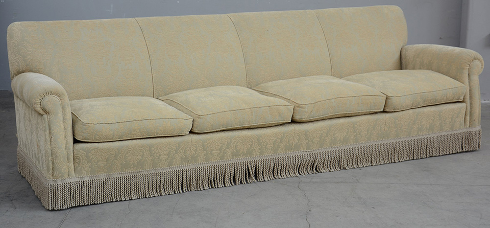 Divano a quattro posti rivestito con tessuto operato con passamaneria a frange (difetti)