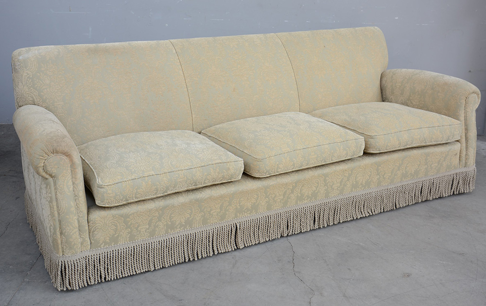 Divano a tre posti rivestito con tessuto operato con passamaneria a frange (difetti)