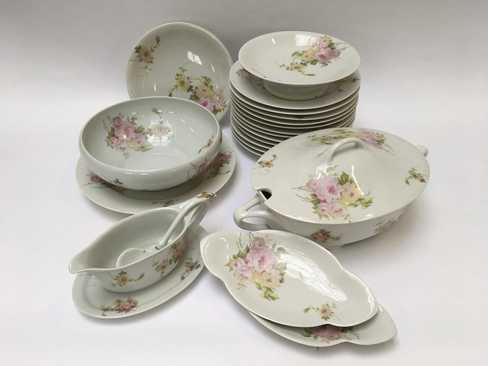 Manifattura Rosenthal, servizio da tavola in porcellana, linea Botticelli, decorato con mazzi di rose, composto da sedici piatti fondi e trentasette piani, quindici piatti per frutta, una insalatiera con piatto, cinque piatti piccoli da portata di dimensioni differenti, due alzatine, zuppiera e salsiera (difetti)