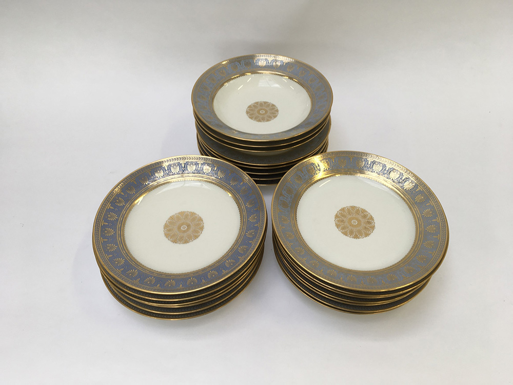Manifattura francese, parte di servizio da tavola in porcellana con tesa color pervinca e decori in oro ad anthemion e fiori stilizzati; composto da tre piatti fondi e diciotto piani, marcati al verso (difetti)