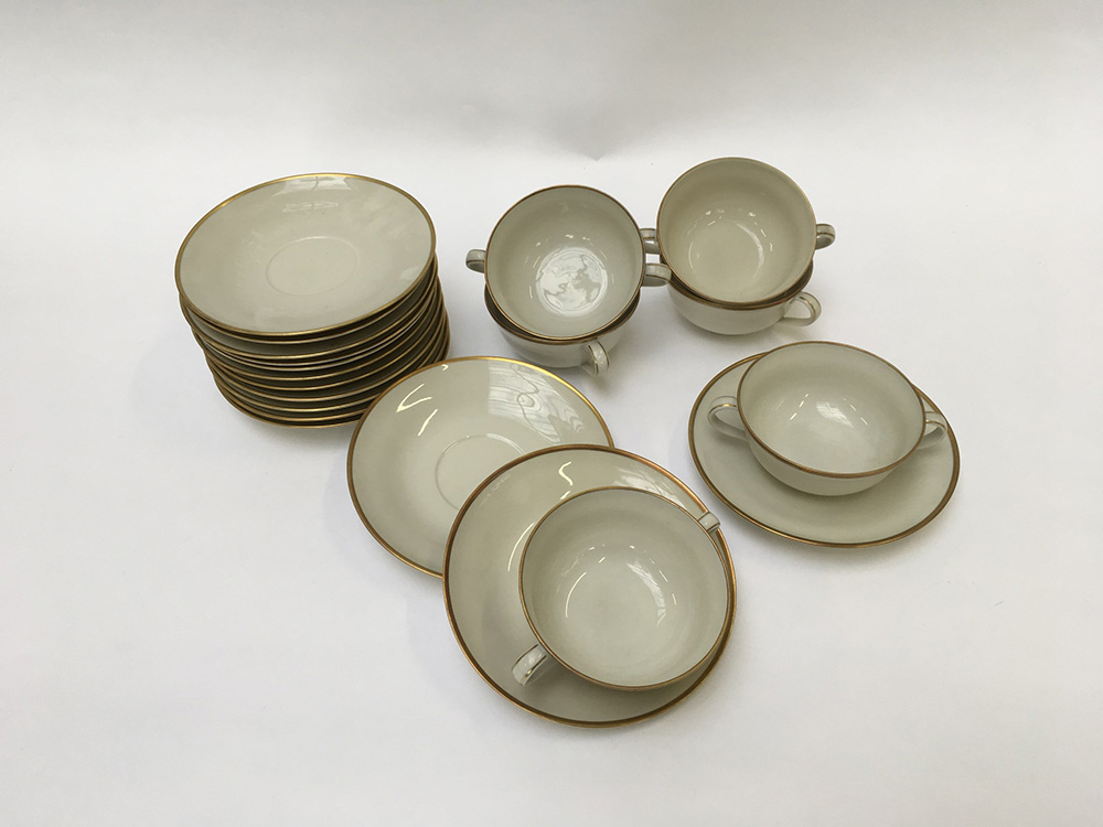 Manifattura Richard Ginori, gruppo di sedici tazze da brodo con quattordici piattini, in porcellana con filettature in oro (lievi difetti)