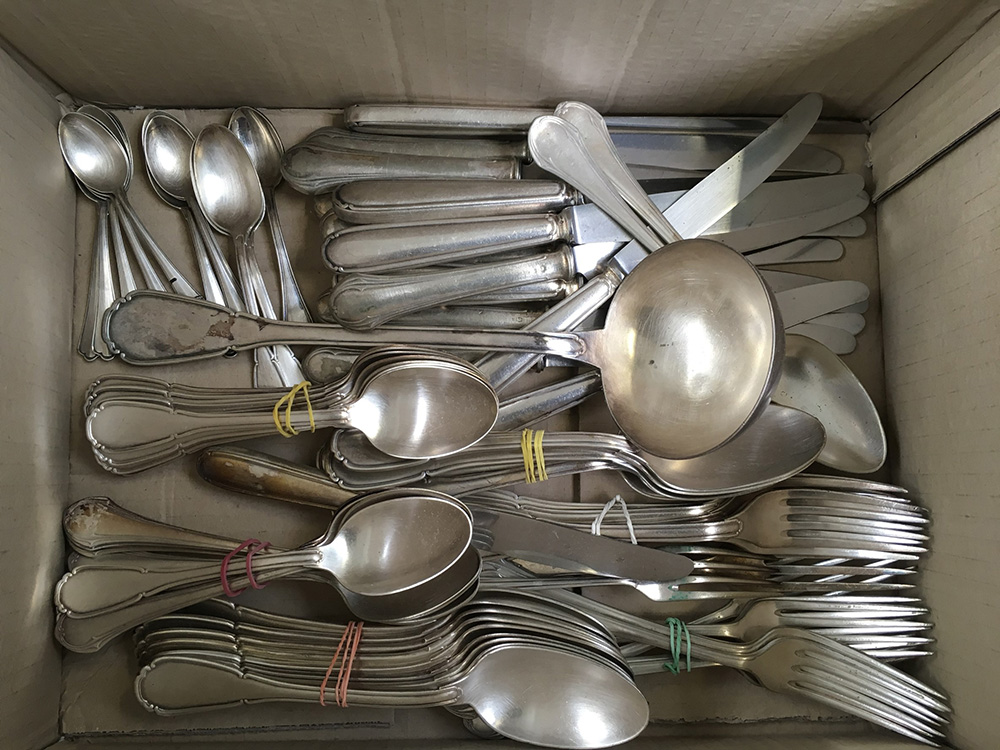 Cartone contenente numerose posate in metallo di fatture differenti (difetti)