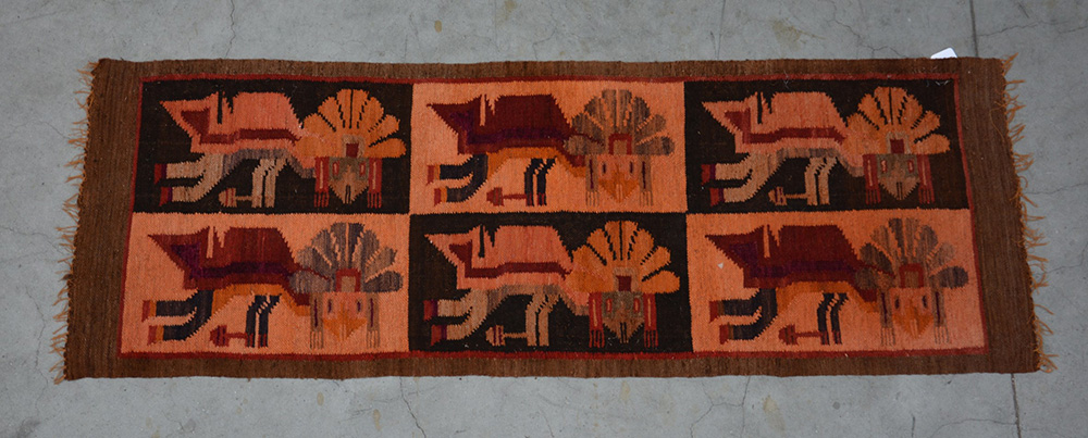 [Tappeti] Arazzo persiano, sec. XX. Decoro inca nei toni del rosa, giallo e bordeaux su fondo marrone (cm 154x55)(difetti)