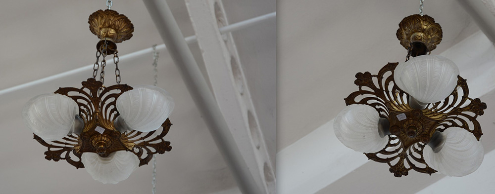 Coppia di lampadari in bronzo a tre luci con coppe in vetro a valva di conchiglia