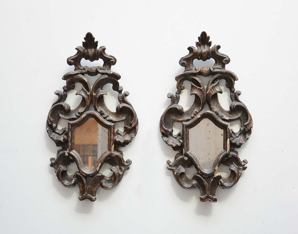Coppia di specchierine in legno intagliato e argentato a volute (cm 76x34) (difetti)