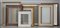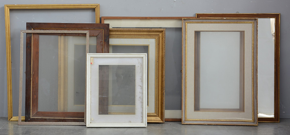 Gruppo di otto cornici di cui una con specchio, di fatture e dimensioni differenti (difetti)