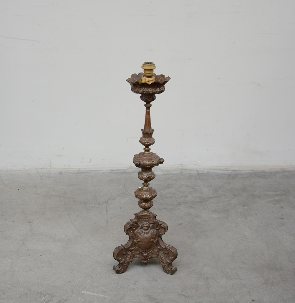 Candeliere in rame sbalzato decorato a putti e motivi vegetali. Sec. XVIII (h. cm 80) Montato a luce elettrica in epoca posteriore