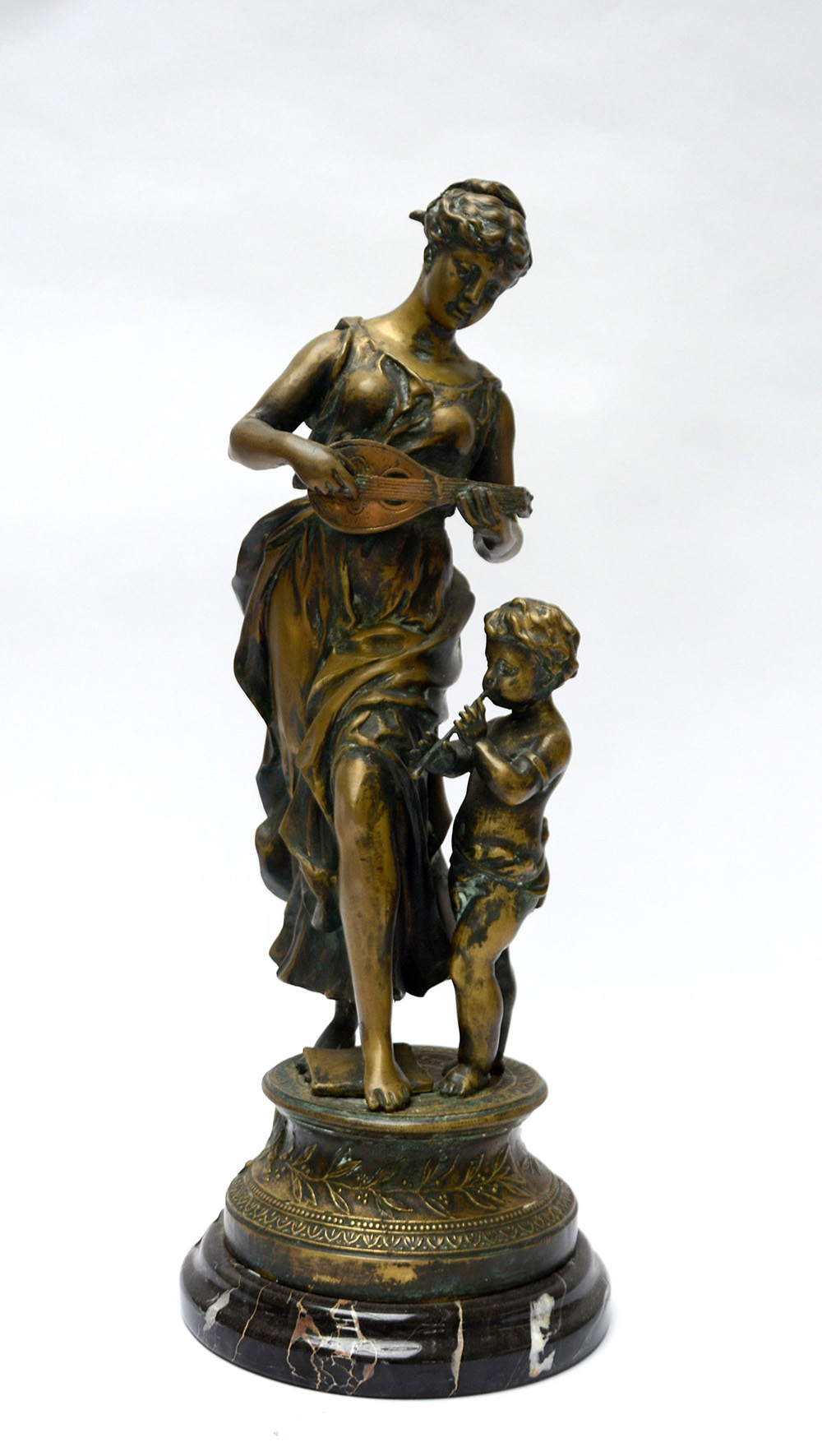 Ignoto "Suonatori" scultura in metallo (h. cm 50) Poggiante su base in marmo nero