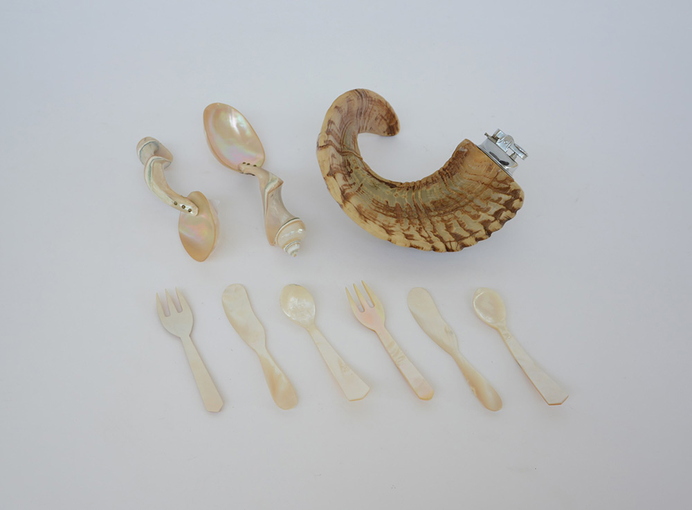 Lotto composto da un accendino da tavolo in corno e due set di posate in madreperla (difetti)