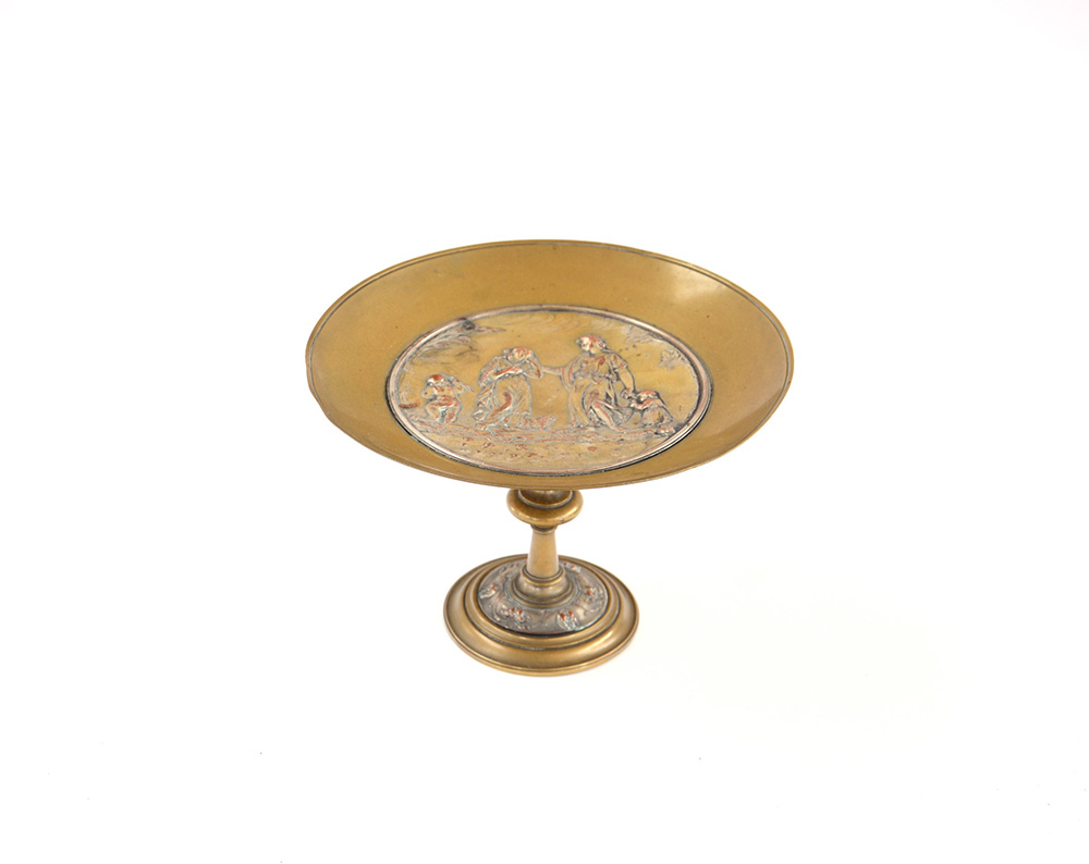 Alzata in bronzo dorato decorata nel cavetto in rame sbalzato a scena...