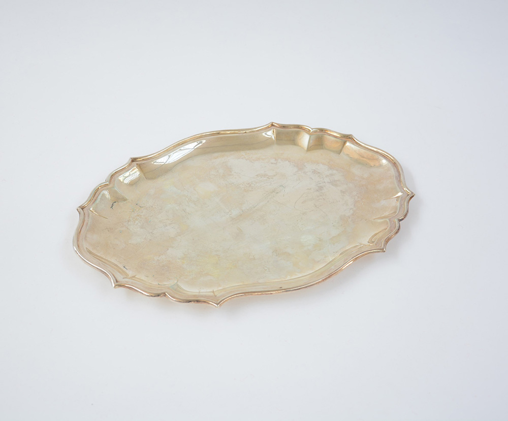 Vassoio in argento di forma ovale mistilinea. Italia, metà sec. XX (cm 37x26) (gr 610 ca.)