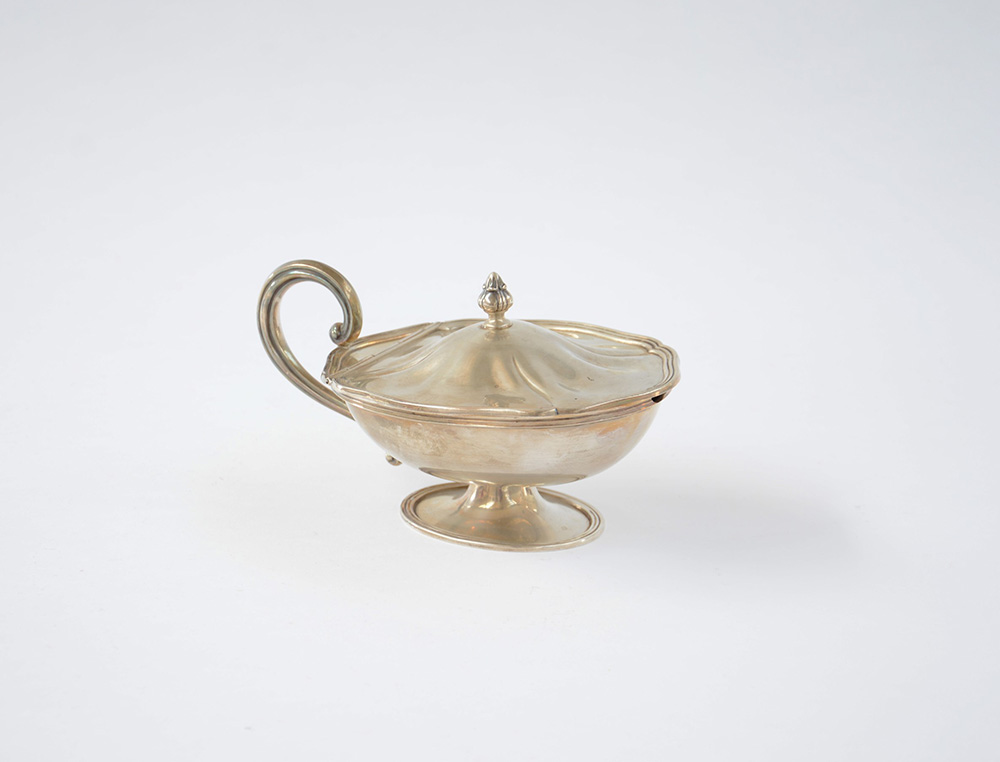 Formaggera in argento di forma ovale con manico ad ansa. Alessandria, metà...