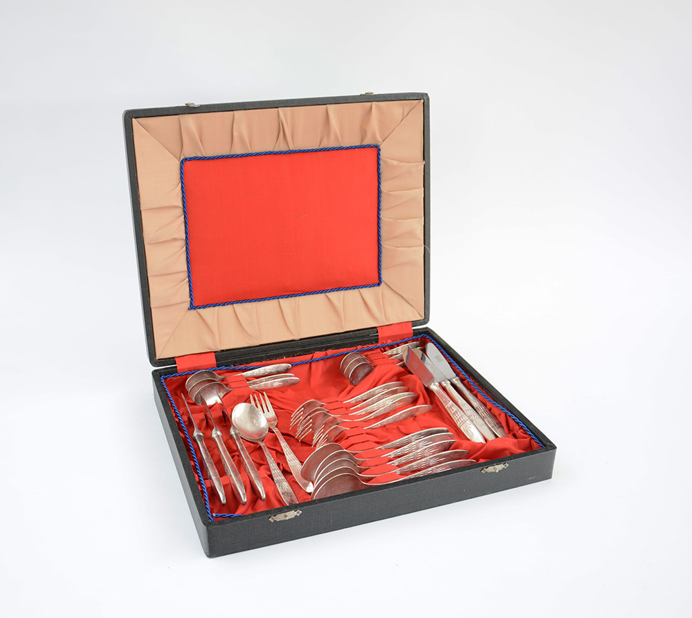 Servizio di posate per sei persone in metallo argentato. In custodia