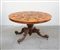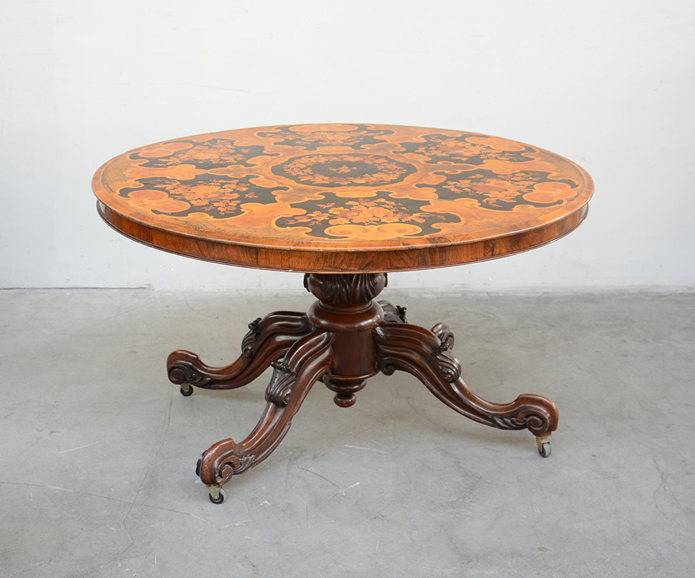 Tavolo da pranzo di forma tonda con piano lastronato in noce ed intarsiato in palissandro e legni vari a vasi fioriti. Gamba centrale a colonna intagliata terminante a quattro piedi sagomati. Francia sec. XIX (d. cm 135 x h. cm 76) (difetti e mancanze)