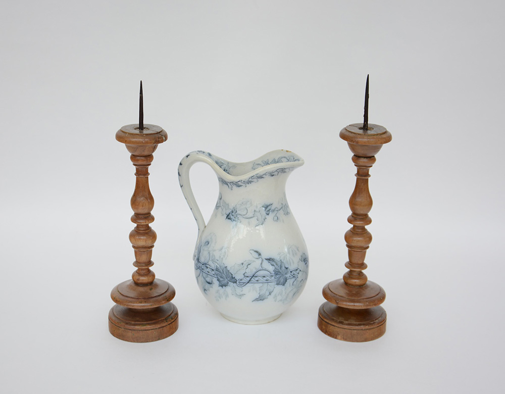 Lotto composto da una coppia di candelieri in legno tornito e una brocca in ceramica (difetti)