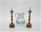 Lotto composto da una coppia di candelieri in legno tornito e una brocca in...
