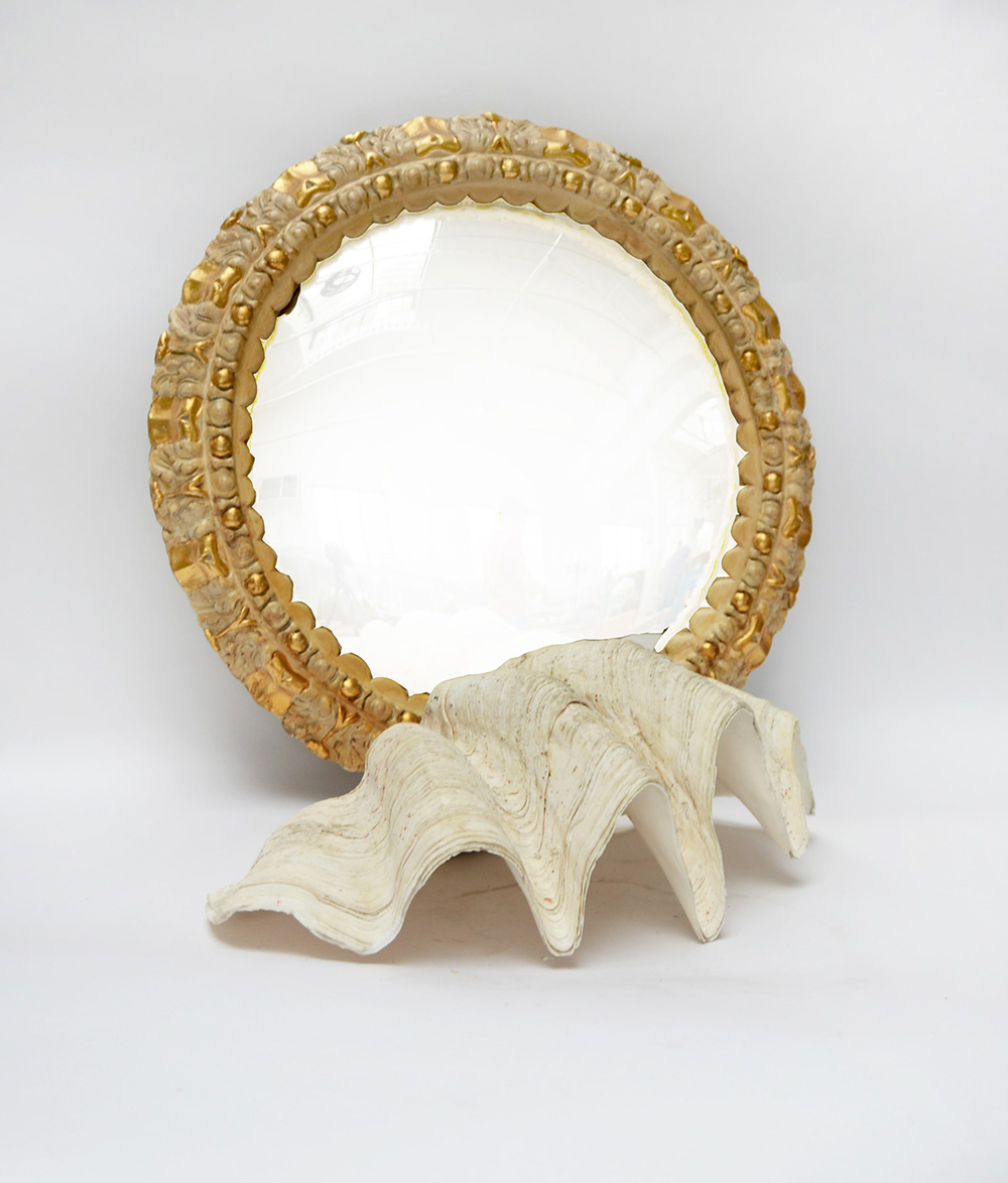 Lotto composto da una grande conchiglia e uno specchio di forma tonda in legno laccato e dorato (difetti)
