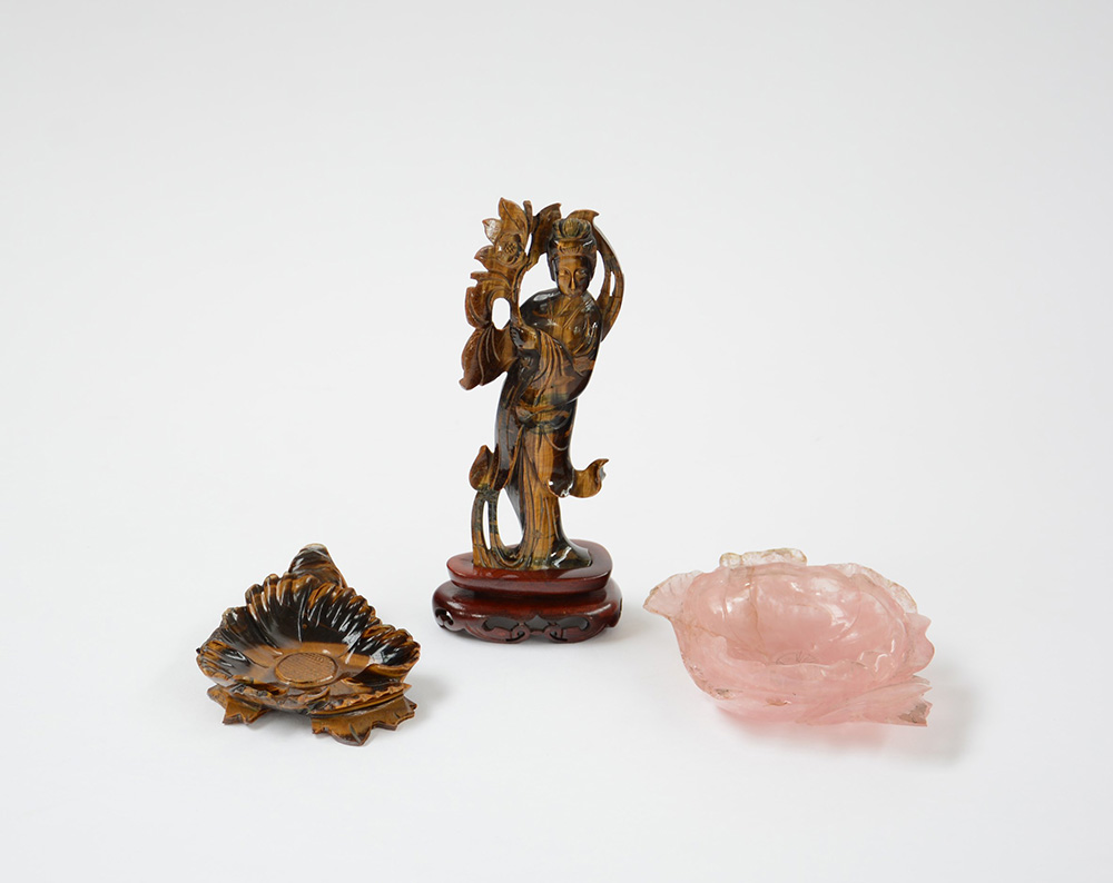Lotto composto da due lavapennelli di forma floreale, uno in quarzo rosa ed uno in occhio di tigre, ed una scultura in occhio di tigre raffigurante dama con fiori con base in legno Cina, se. XX (h. max 16 cm) (gravi difetti)