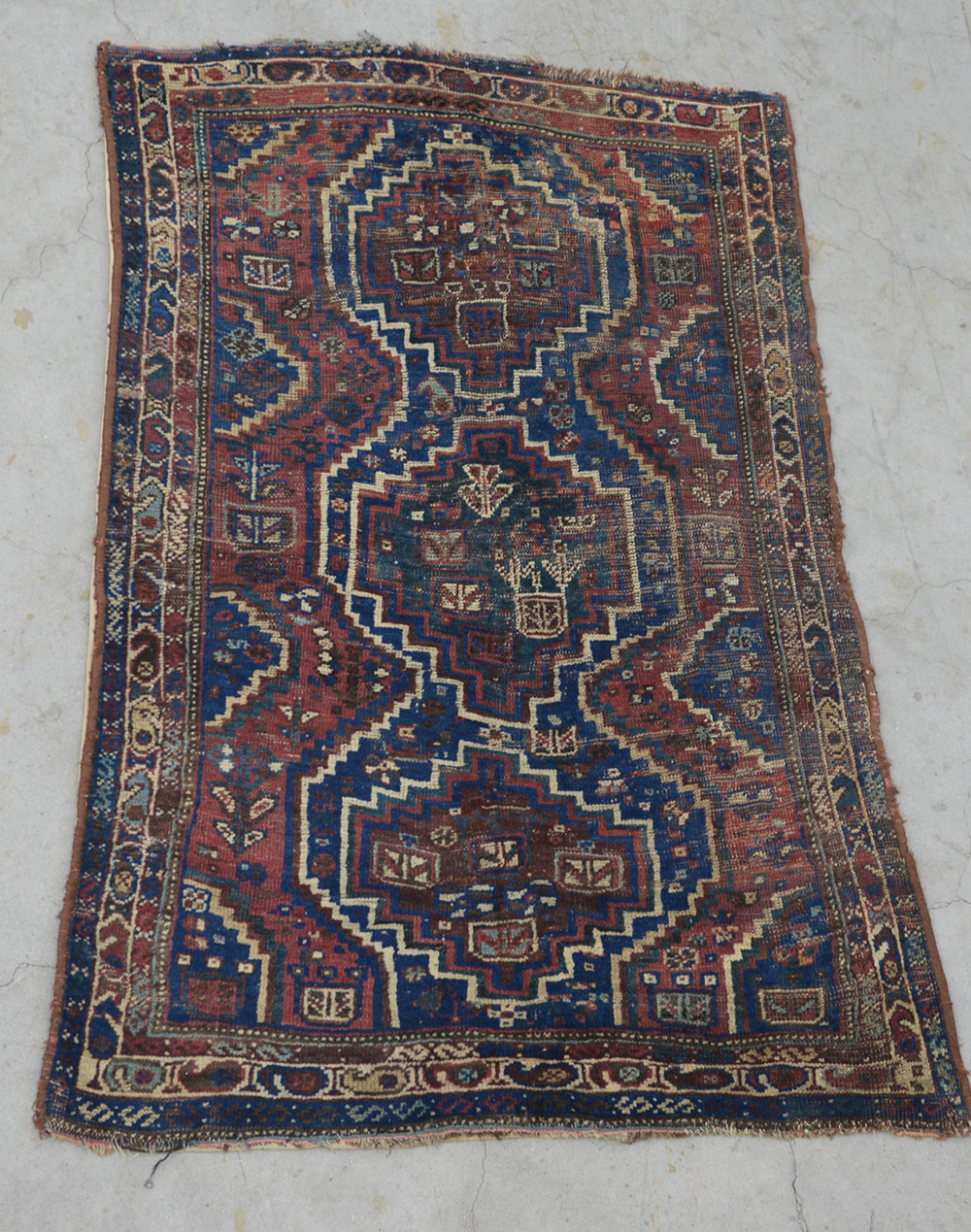 [Tappeti] Tappeto Shiraz, Persia sec. XX. Disegno con tre medaglioni su campo blu (cm 128x70) (difetti e rotture)