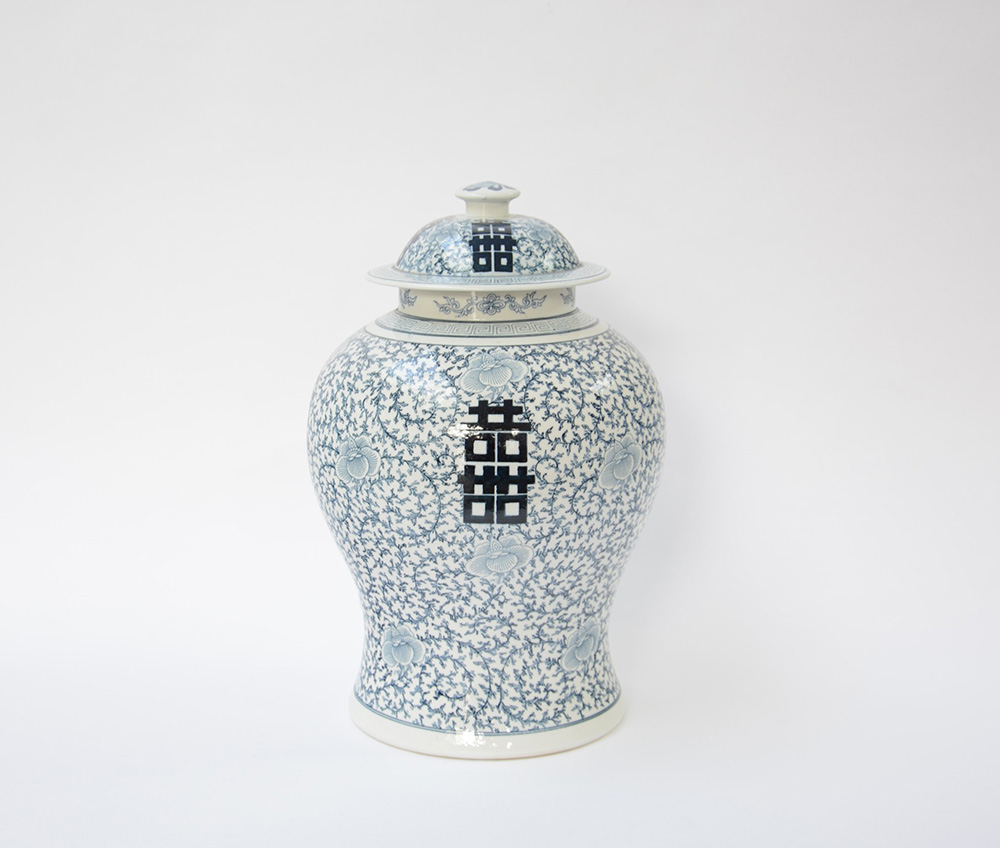 Manifattura cinese. Vaso con coperchio in porcellana bianca e blu decorato con motivi floreali e caratteri di buon augurio doppio "xi" (difetti) Cina (h. cm 47)