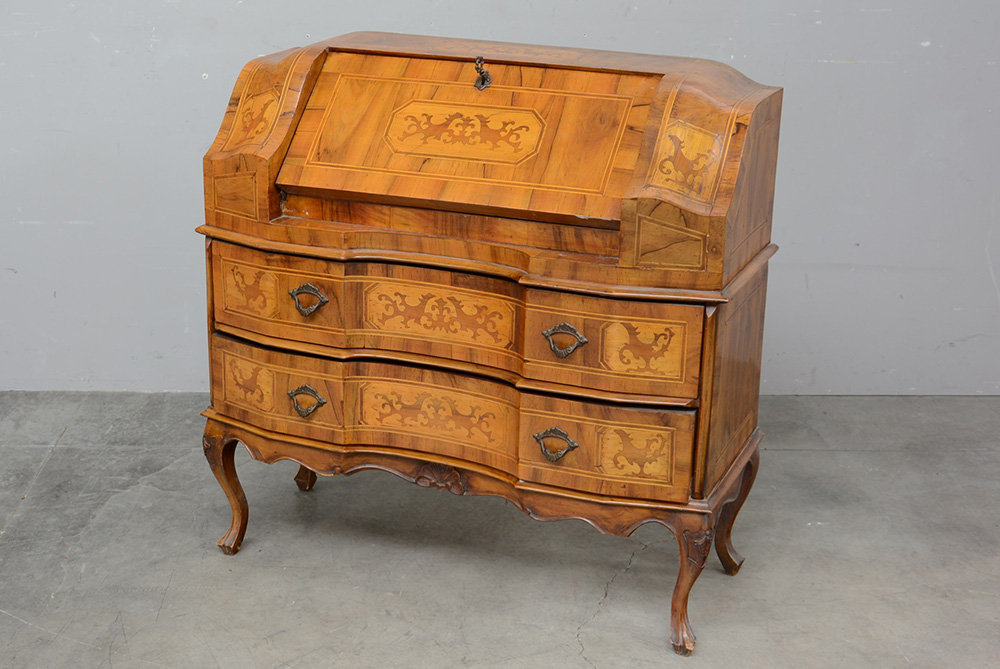 Piccola ribalta a due cassetti lastronata in noce con filettature a contrasto, fronte mosso e calatoia celante due cassetti e vano portacarte, sec. XX (cm 90x91x39) (difetti)