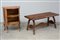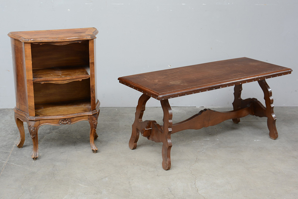 Lotto composto da un tavolino da salotto con gambe sagomate (cm 103x47x43) e un comodino a due ripiani lastronato in noce e filettato (cm 54x73x28) (difetti)