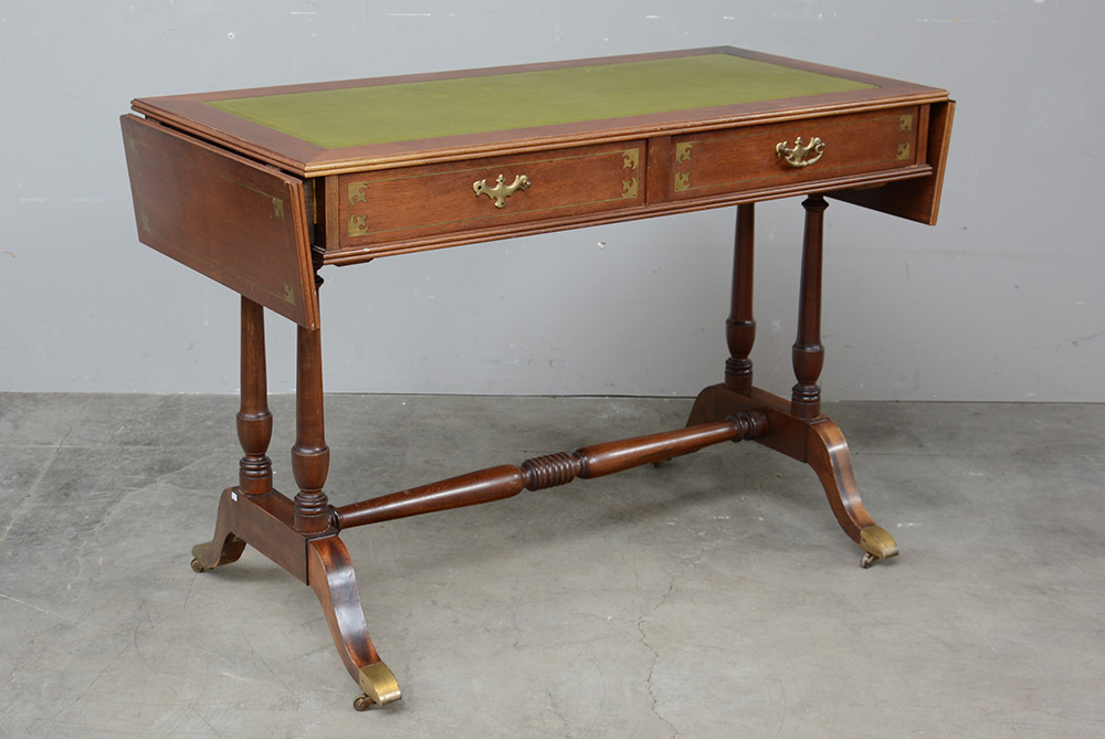 Scrittoio da centro a due cassetti con gambe a balaustro riunite da traversa, piano ad alette con inserto in pelle verde, filettature e guarnizioni in metallo, sec. XX (chiuso cm 120x79x54) (difetti)
