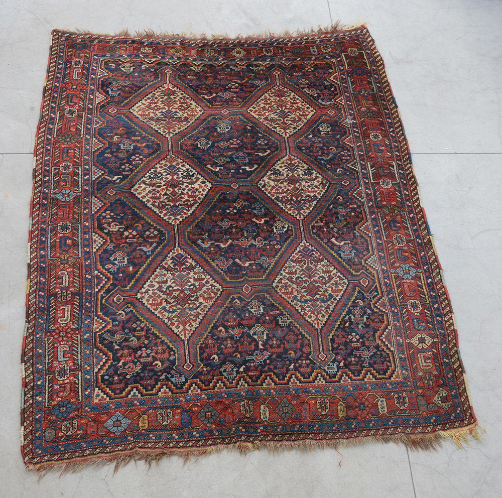[Tappeti] Tappeto Qashqai, Persia, fine sec. XIX. Disegno a sei medaglioni bianchi su campo blu (cm 225x154) (difetti)