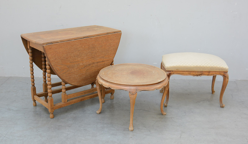 Lotto composto da un tavolo ad alette, un panchetto e un tavolino rotondo in legno