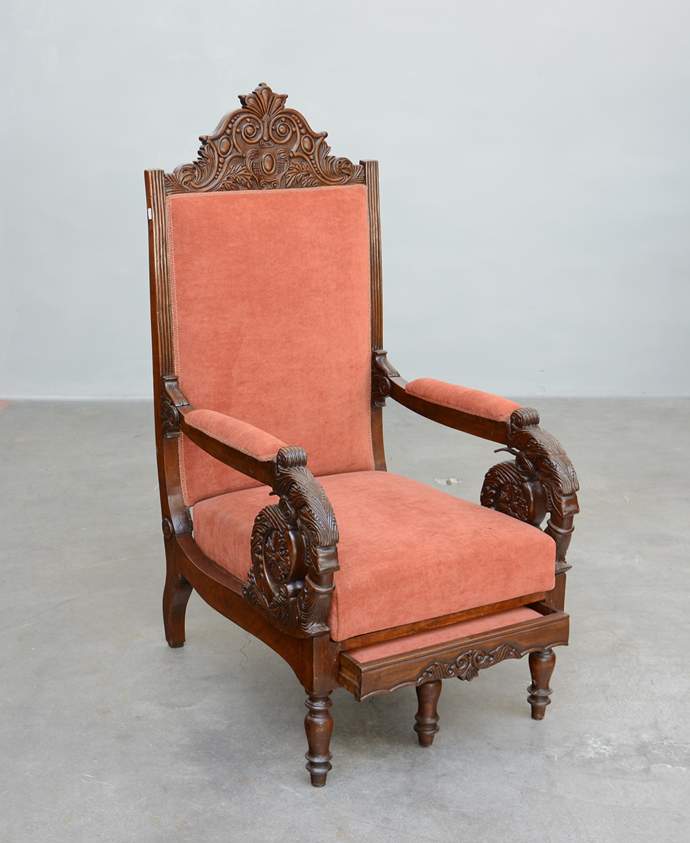 Poltrona con schienale reclinabile, cimasa e braccioli intagliati a volute e teste d'aquila. Fascia estraibile con poggiapiedi. Sec. XIX (difetti)