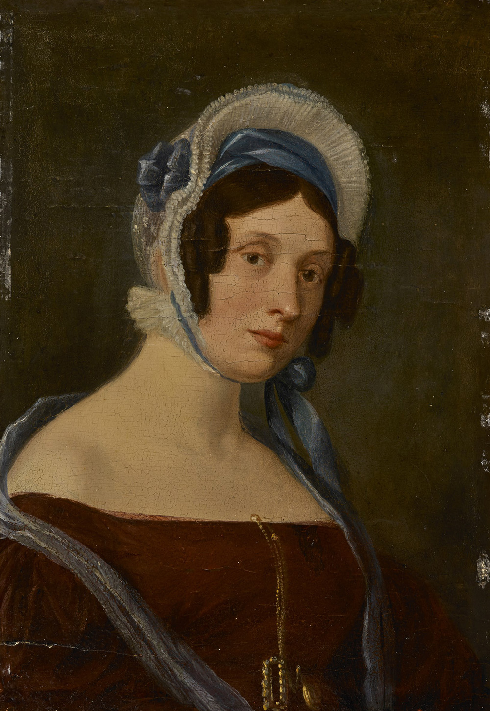 Scuola del sec. XIX "Ritratto di gentildonna in abito rosso" olio su tavoletta (cm 26x18) Inscritto e datato 1836 al retro. In cornice del sec. XIX in legno dorato (restauri)