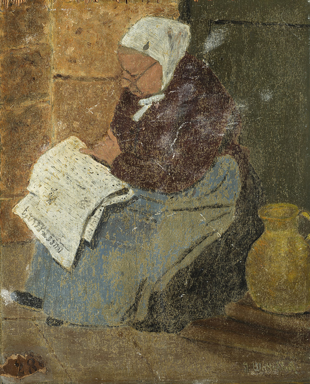 Firma indecifrata "Anziana che legge" olio su tavoletta (cm 28x23) In cornice (difetti)
