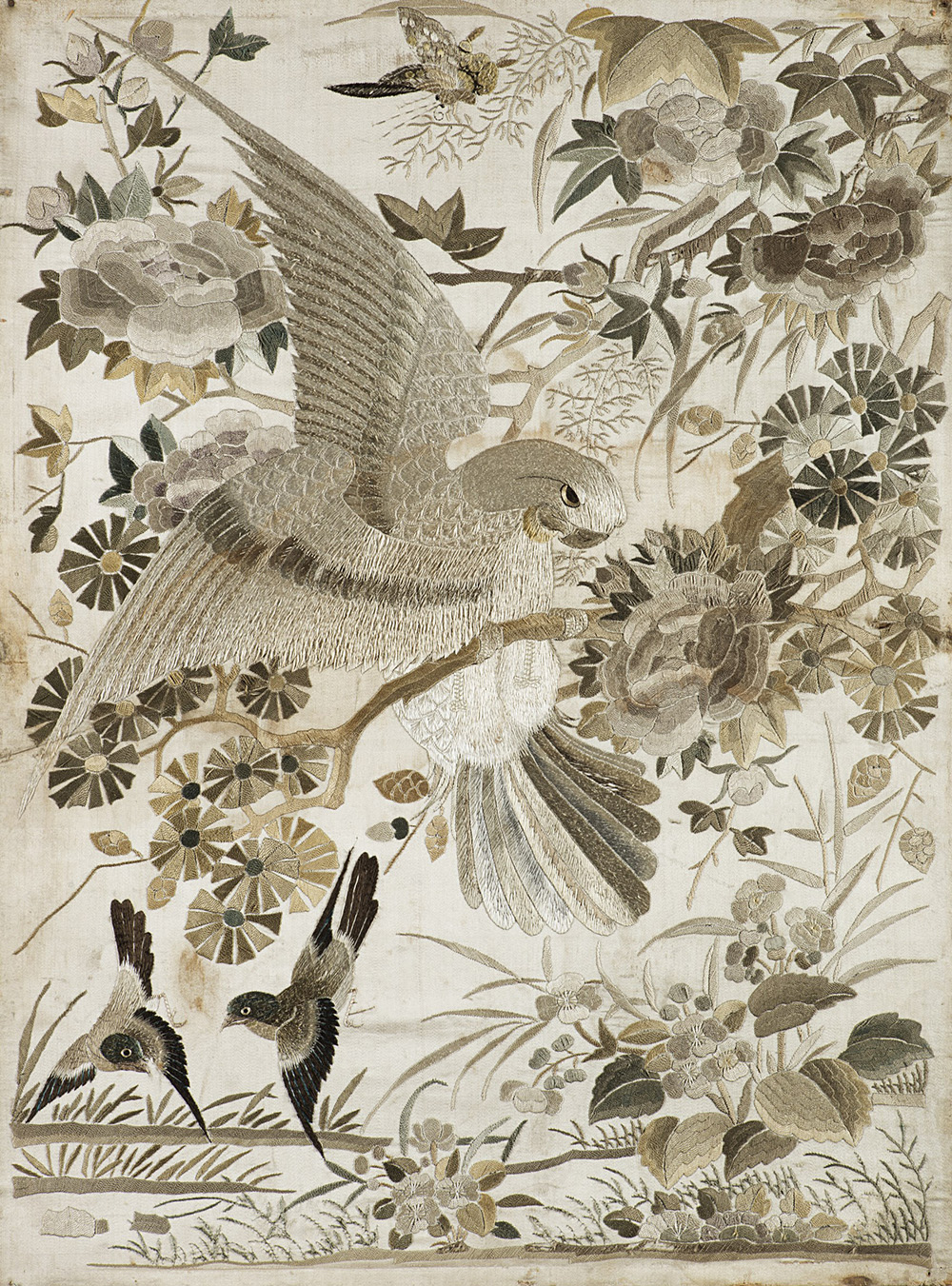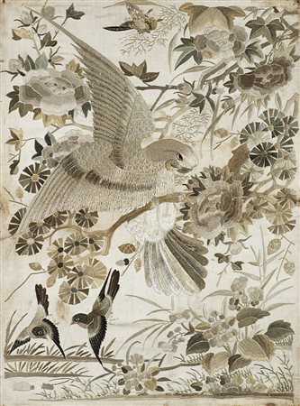 Tessuto ricamato con volatili e fiori (cm 59x43) In cornice (difetti)