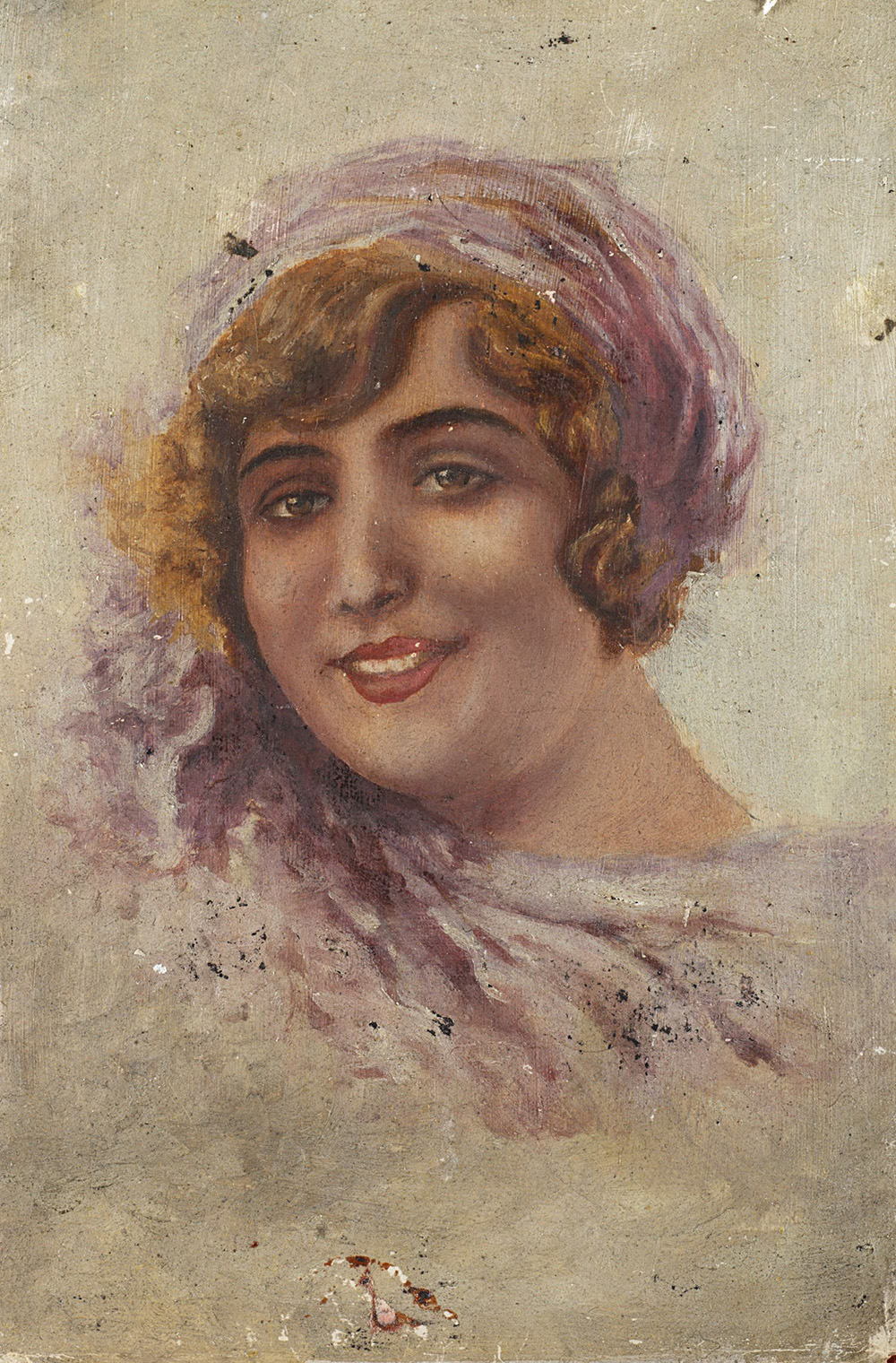 Scuola inizio sec. XX "Ritratto di giovane donna con copricapo prugna"...