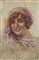 Scuola inizio sec. XX "Ritratto di giovane donna con copricapo prugna" acquerello su cartoncino (cm 20x13,5) In cornice (difetti)