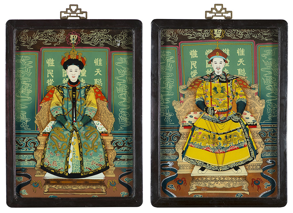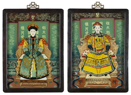 Lot 3333 | Coppia di verre peint raffiguranti imperatore ed imperatrice assisi, sec. XX...