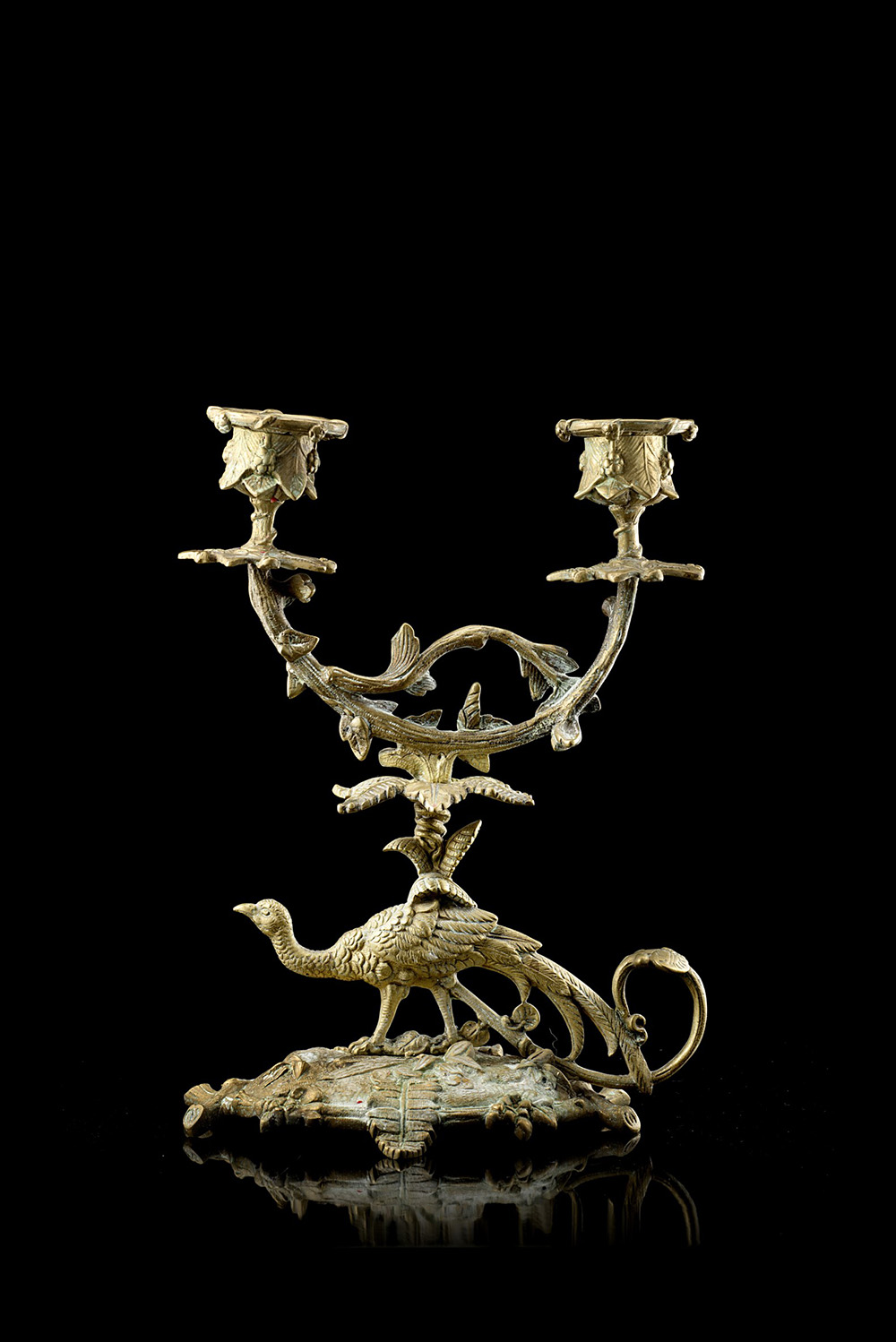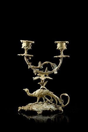Candeliere a due luci in metallo dorato, fusto decorato con fagiano e rocaille di foglie (h. cm 26)