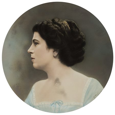 Ignoto "Ritratto di gentildonna in abito azzurro" foto ritoccata (d. cm 33) Firmata e locata in basso a destra. In cornice in legno intagliato e dorato (difetti)
