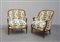 Coppia di bergère con struttura in legno intagliato e gambe rastremate, rivestite con tessuto stampato, sec. XX (lievi difetti)