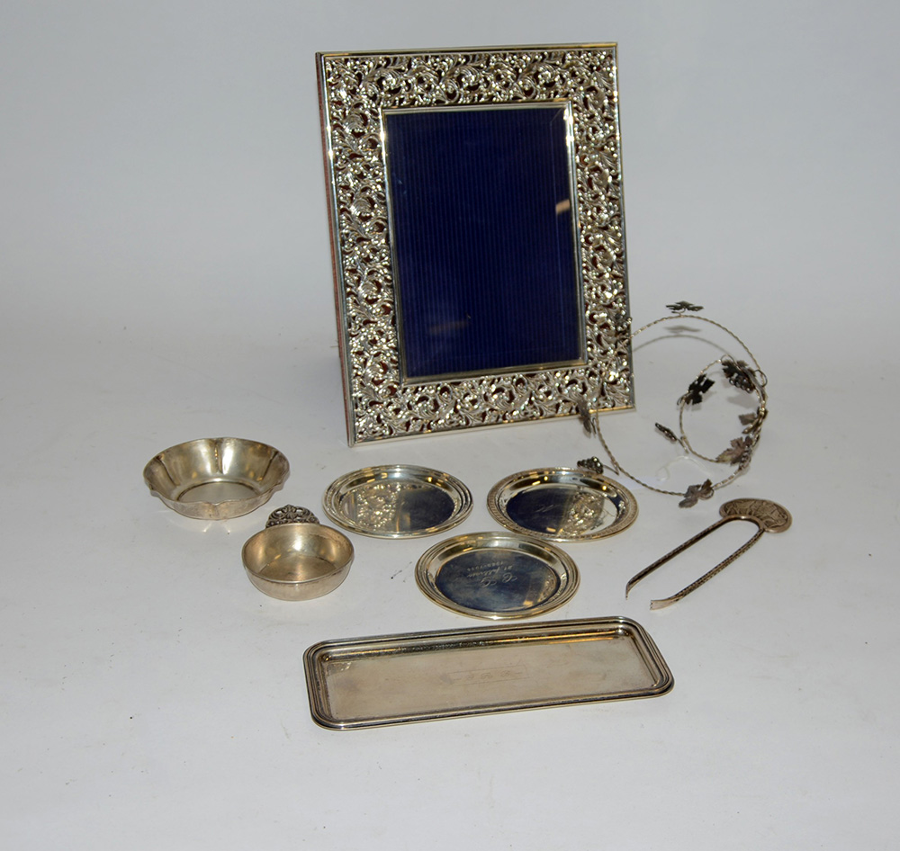 Lotto di argenti composto da una cornice porta foto, tre sottobicchieri, due piccoli contenitori, un portapenne, una pinza e un fregio a spirale decorato con grappoli e foglie d'uva (gr 300) (difetti)