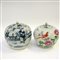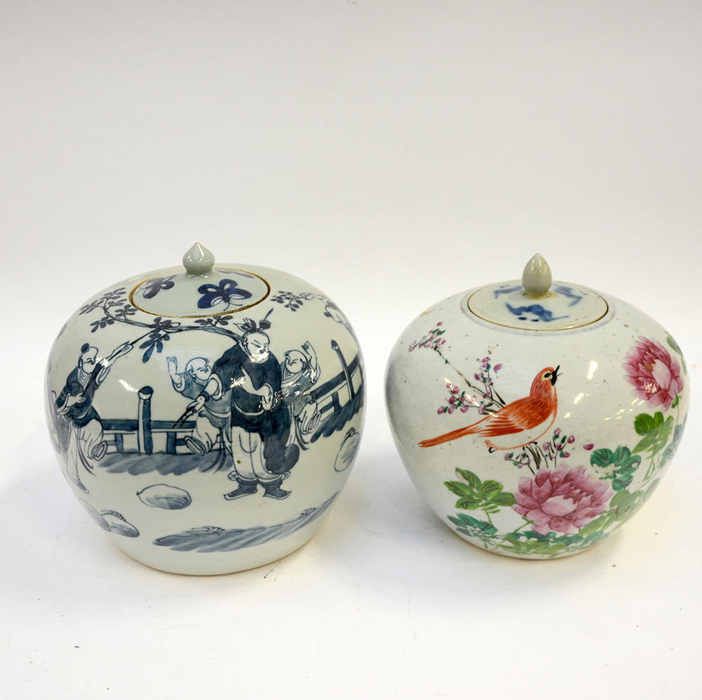 Lotto di due potiches con coperchi, una in porcellana bianca e blu su fondo celaton, l'altra con smalti policromi. Cina, sec. XX (h max cm 22) (difetti)