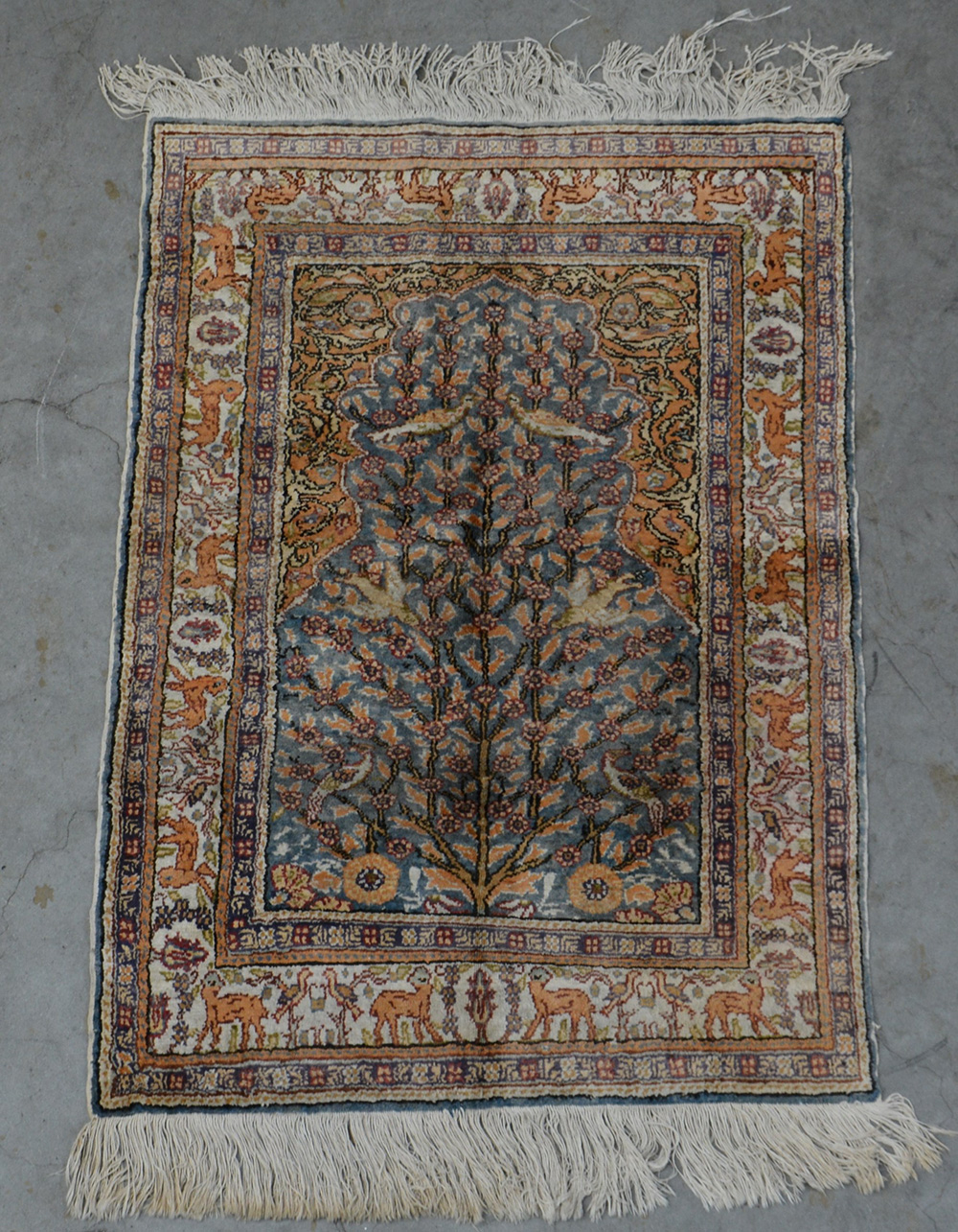 [Tappeti] Tappeto-preghiera Kaisery, Anatolia, sec. XX con albero della vita nei toni dell'arancio, azzurro e bianco, annodato in cotone mercerizzato (cm 127x87) (difetti)
